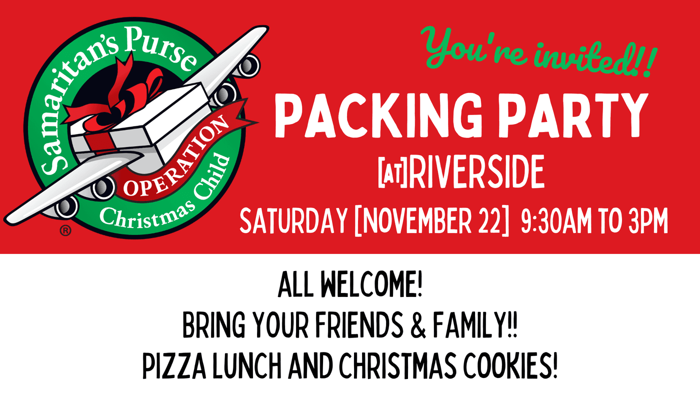 Operation Christmas Child 2025Join us on Saturday, November 22nd for a joyful day of packing shoeboxes for Operation Christmas Child! Bring your friends, family, and holiday spirit – everyone is welcome. We''ll have pizza lunch and Christmas cookies while the festive tunes play.